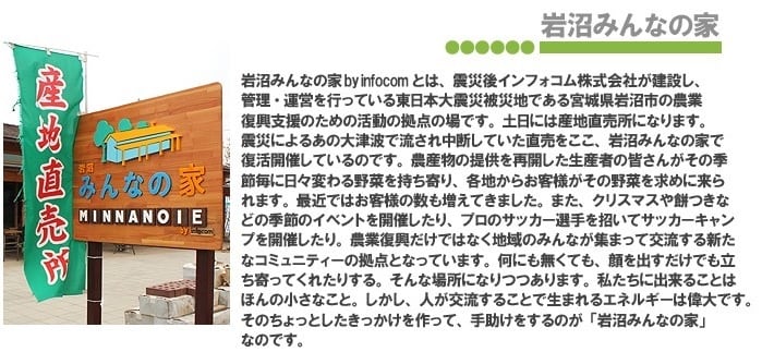 岩沼みんなの家は、東日本大震災の復興支援活動を目的に「絆を繋ぎ、みんなが交流・コミュニケーションできる場所」として岩沼市玉浦地区に2013年7月に竣工した多目的コミュニティ施設です。大津波で流されてしまった直売所「かあちゃん広場」を復活開催した「みんなの直売!」を毎週土曜に、その地場野菜を使ったランチプレートや野菜たっぷりカレーを提供する「みんなのランチ」を月曜と水曜に、その他、夏祭りやハロウィンやクリスマスといったイベントや、各種教室開催、アグリツーリズムと題した復興ツーリズムなどを通年開催しています。