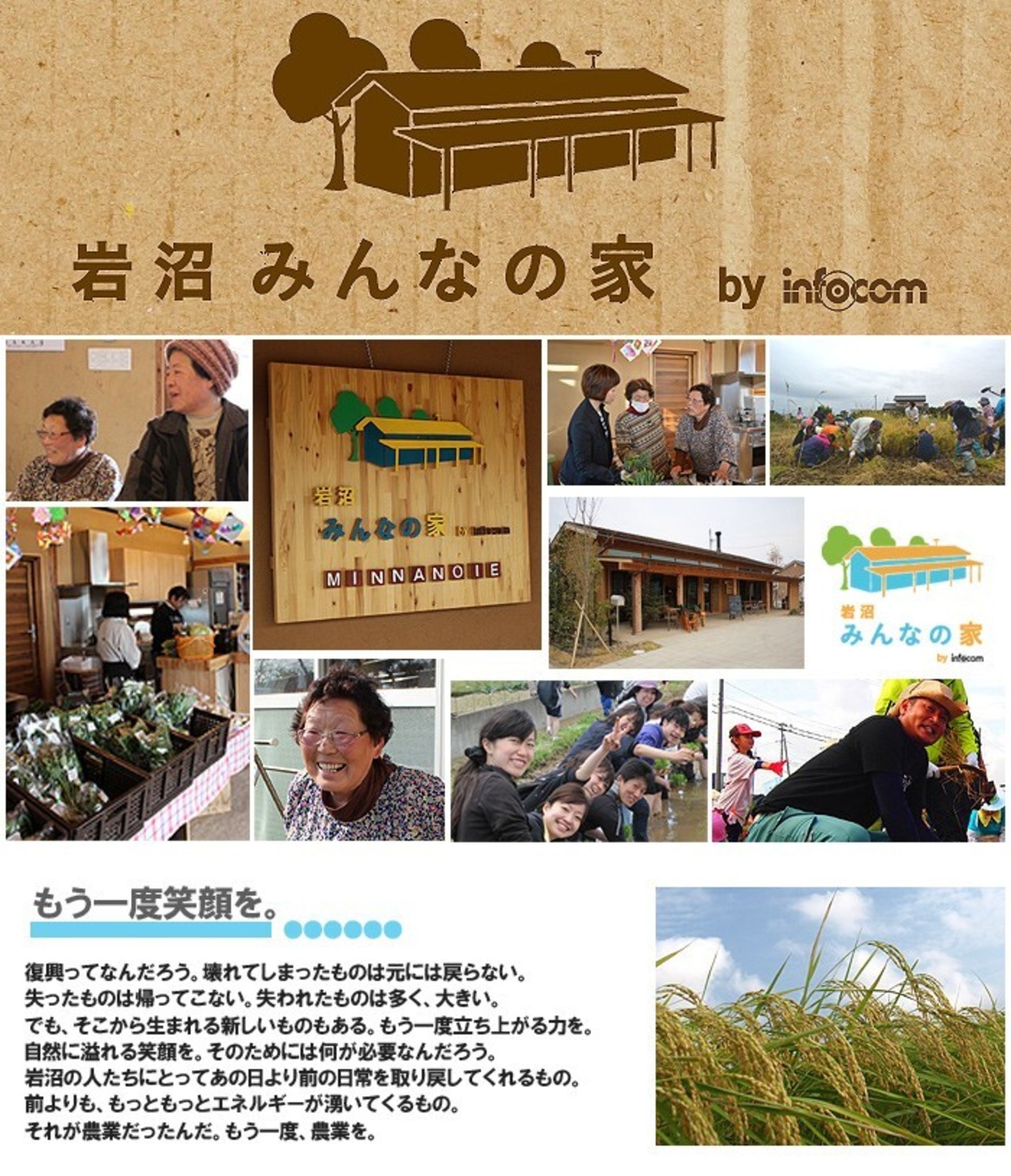 岩沼みんなの家は、東日本大震災の復興支援活動を目的に「絆を繋ぎ、みんなが交流・コミュニケーションできる場所」として岩沼市玉浦地区に2013年7月に竣工した多目的コミュニティ施設です。大津波で流されてしまった直売所「かあちゃん広場」を復活開催した「みんなの直売!」を毎週土曜に、その地場野菜を使ったランチプレートや野菜たっぷりカレーを提供する「みんなのランチ」を月曜と水曜に、その他、夏祭りやハロウィンやクリスマスといったイベントや、各種教室開催、アグリツーリズムと題した復興ツーリズムなどを通年開催しています。